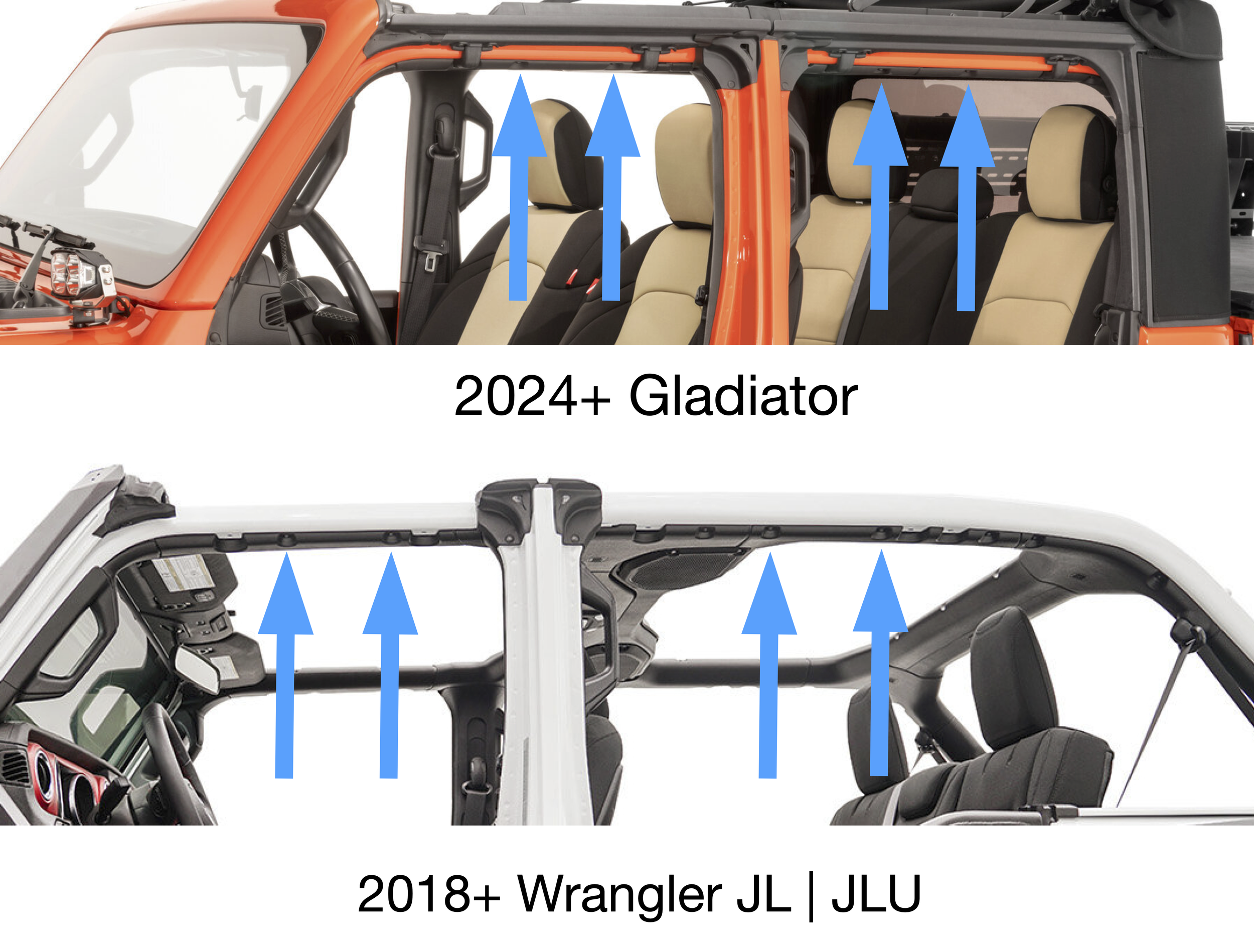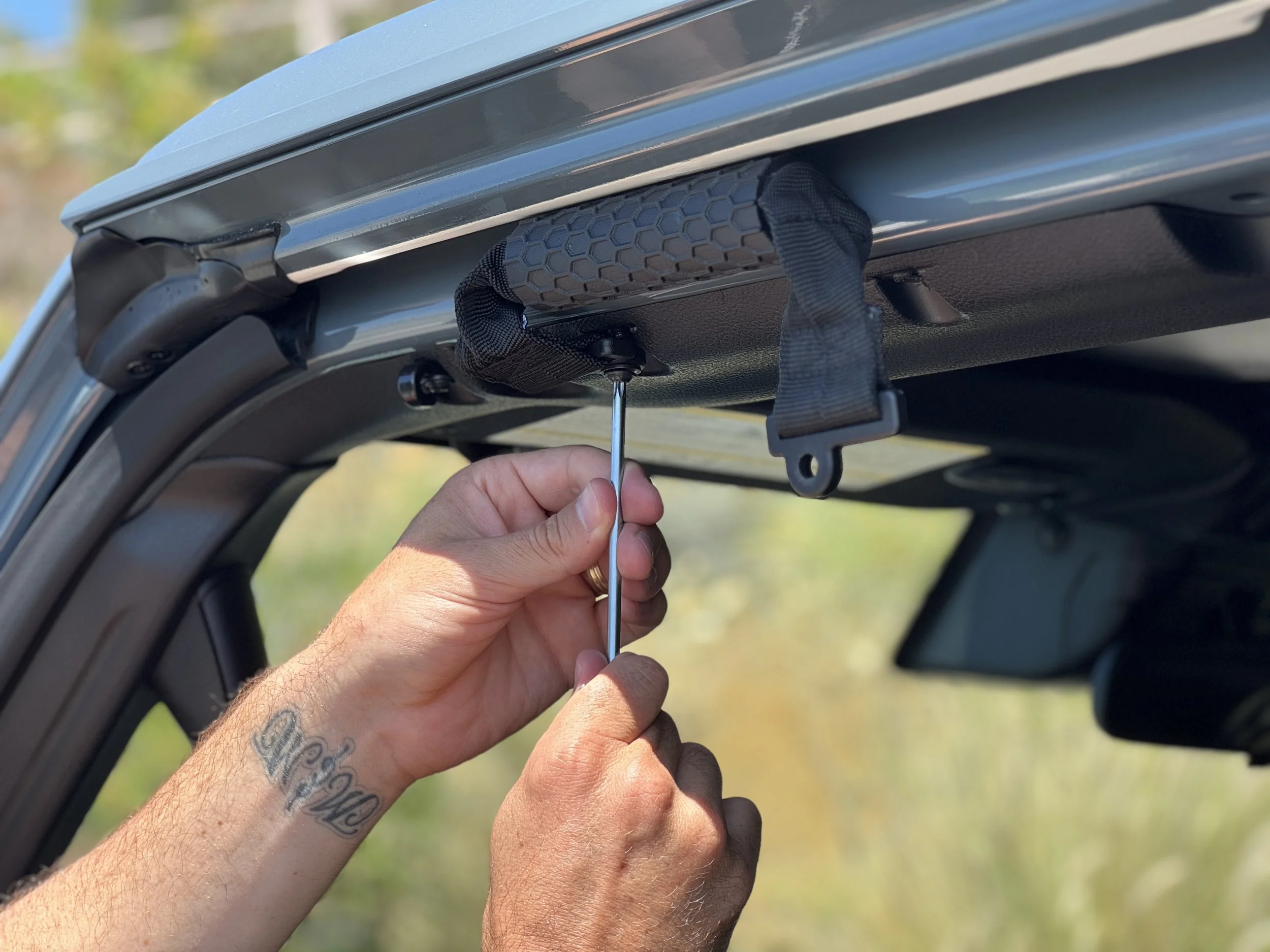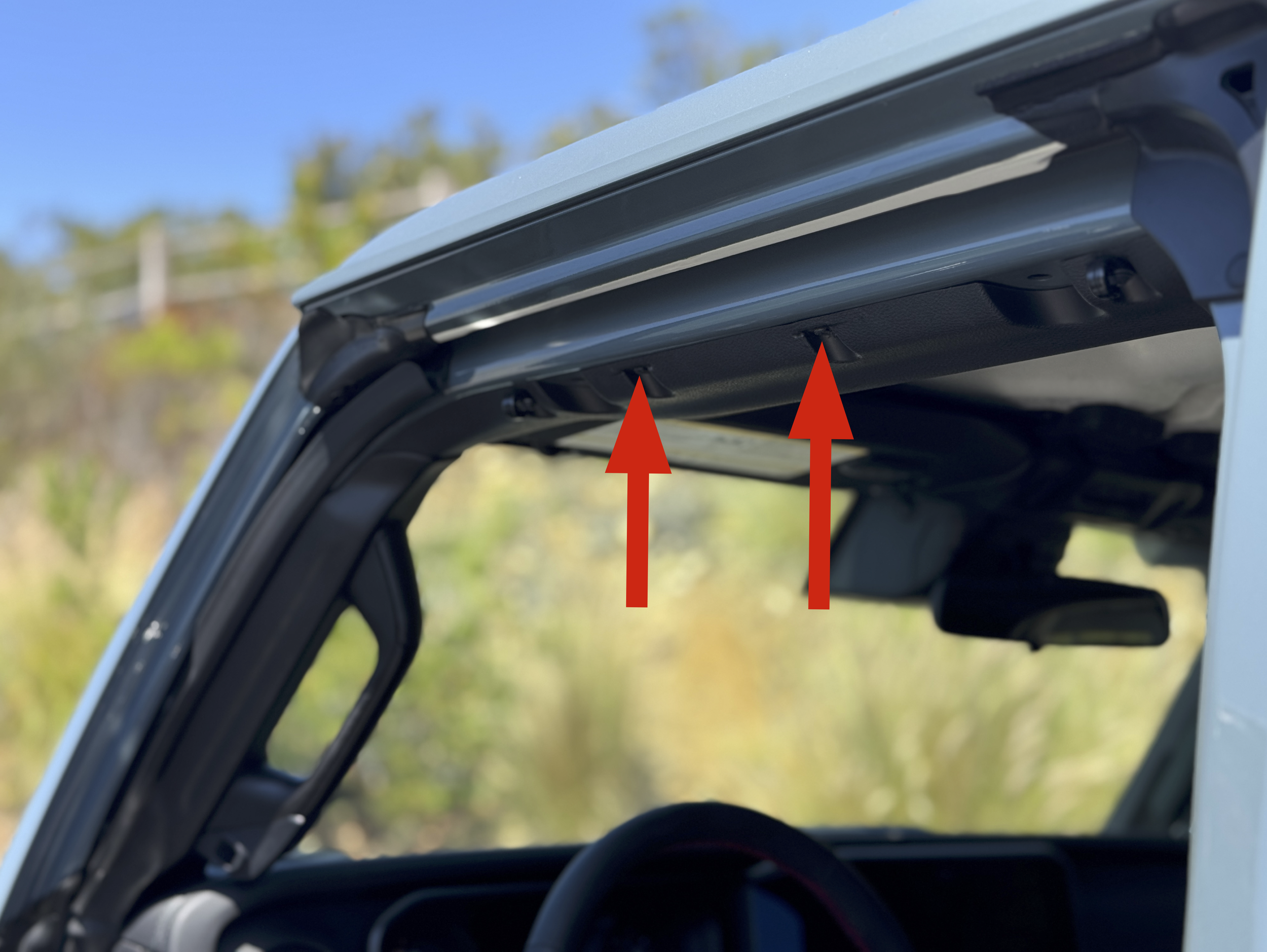Start by locating the factory mounting points, which will be 2 single screws centered between each door. 2021-2023 Gladiators will only be able to use our handles on the front doors and 2024+ Gladiators will have both front and rear lower mounting points.