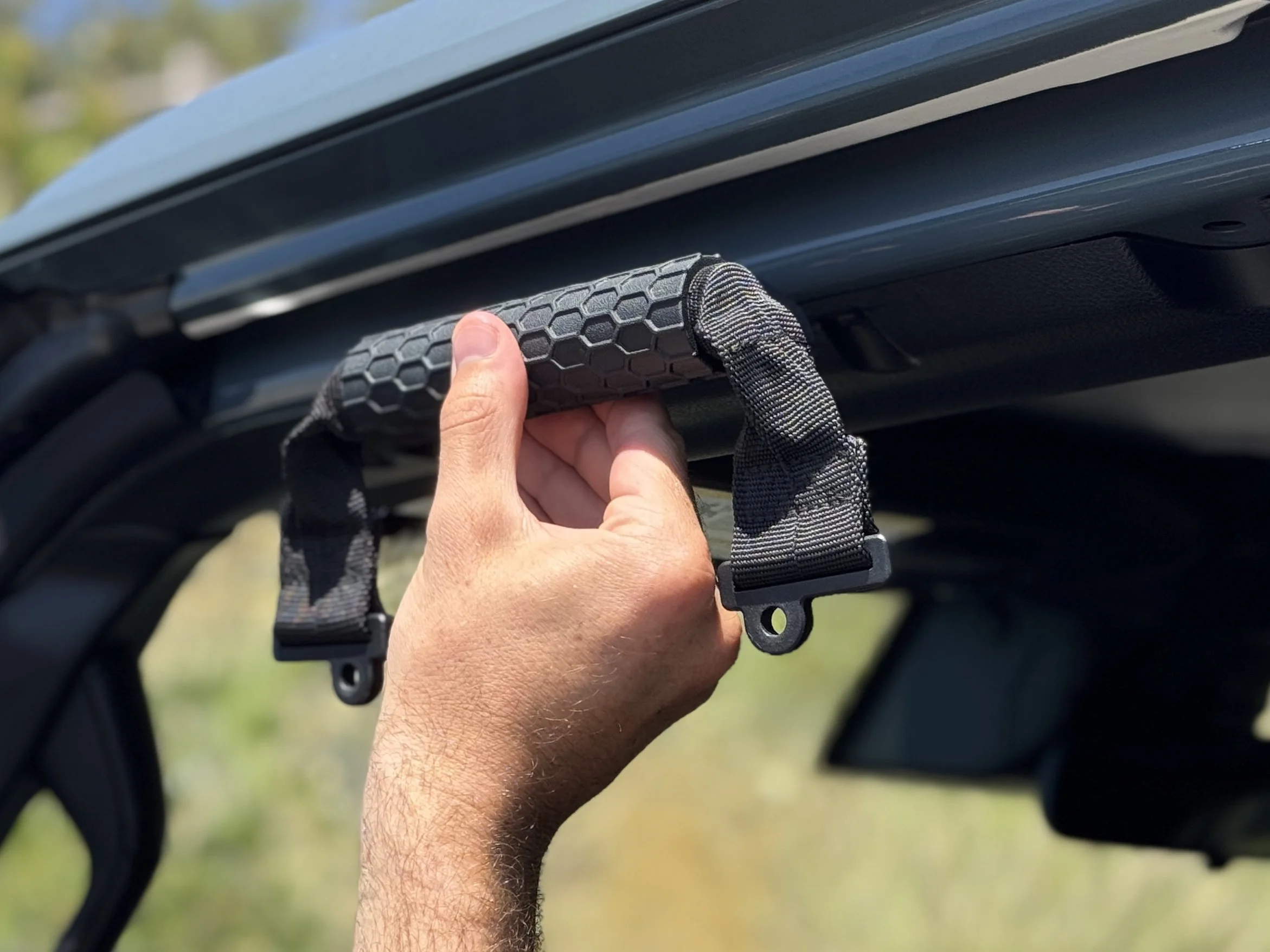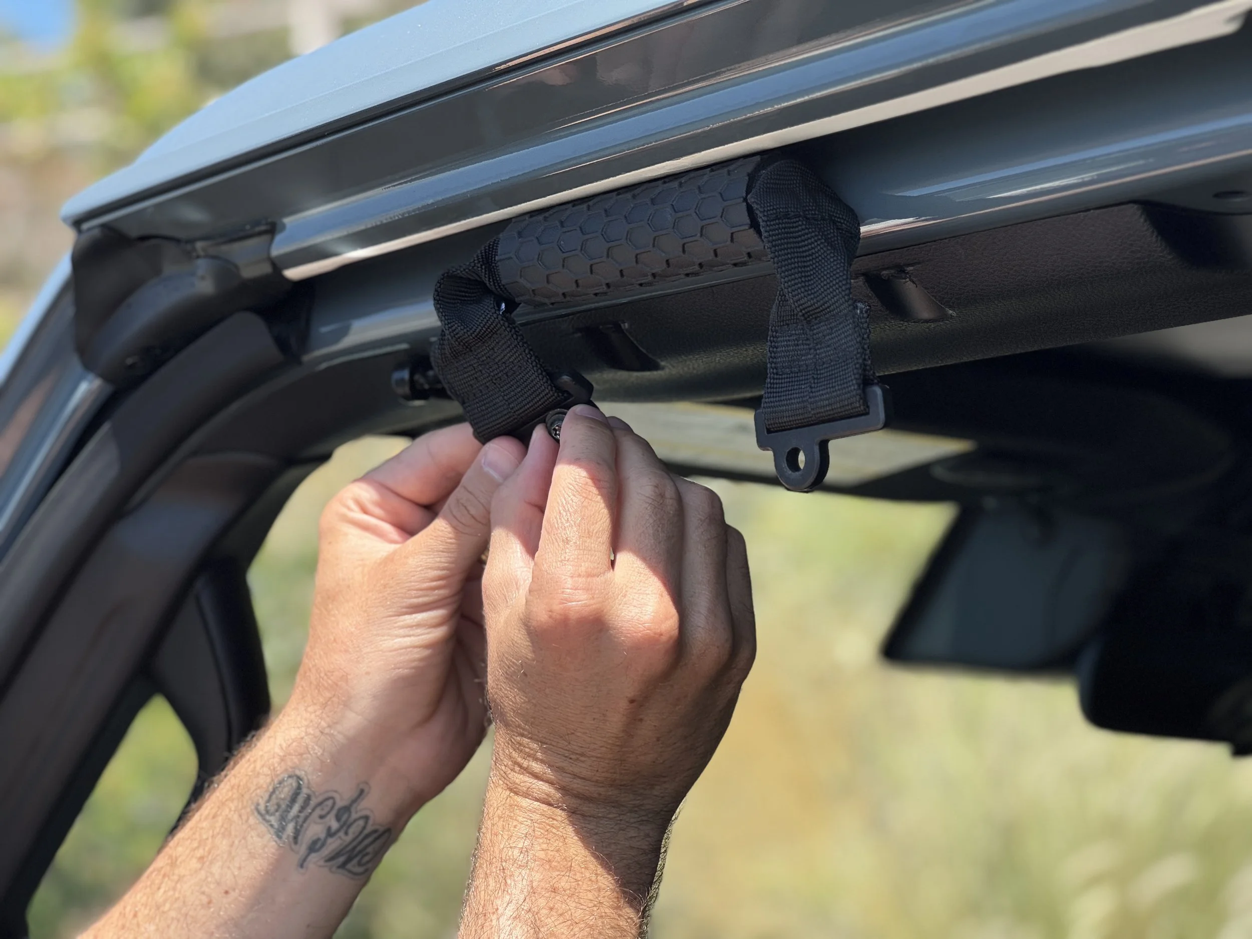 Once you have the proper orientation with the tag facing the outside of the vehicle and on the left side, stick the handle to the sport bar to help hold it in place.