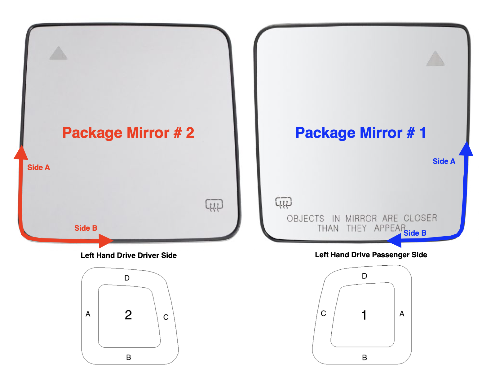 Our Jeep F0600 mirrors are designed to be multi-angular so they can custom fit the top or bottom outer corners of your Jeep factory mirrors. It may be a bit tricky to see at some angles; however, each mirror is physically marked on the back with a number 1 and 2 in the center, and A,B,C,D on the sides. To prevent breakage during shipment, many of our mirror products will sit in the package differently than they orient or align on the vehicle. Here is how the mirrors are aligned as they sit in the package: